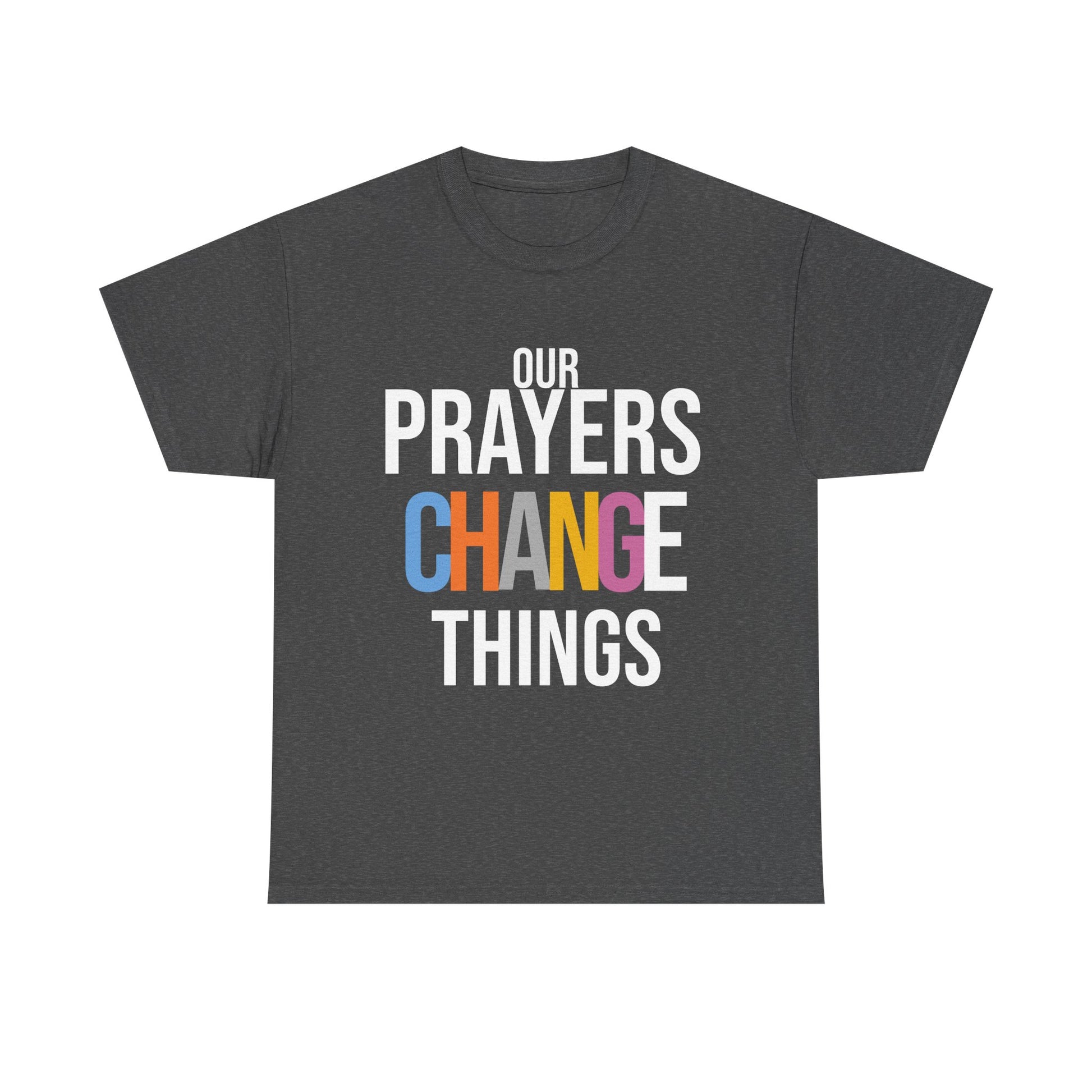Elevate your casual wardrobe with this Unisex Heavy Cotton Tee, designed for comfort and style. The bold statement "OUR PRAYERS CHANGE THINGS" sparks conversations and uplifts spirits, making it perfect for gatherings, community events, or simply sharing your positive vibes. This tee resonates with those who value faith, spirituality, and empowerment. It's an ideal gift for friends, family, or anyone looking to spread a message of hope. Perfect for occasions like church services, family reunions, or casual nights out, this shirt easily transitions from a day at home to a night out with friends. Make a statement while enjoying unparalleled comfort!